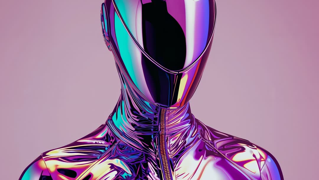 AI Generated Image. Visual explores essence of futuristic technology and innovation through a shimmering metallic figure set against muted pink backdrop. Figure's reflective metallic suit and connected helmet express both minimalism and complexity, evoking sci-fi aesthetics. Suitable for projects exploring future technologies, sci-fi worlds, artificial intelligence themes, or conceptual design in modern art. Ideal for visual media, tech branding, digital art pieces, or futuristic storytelling.