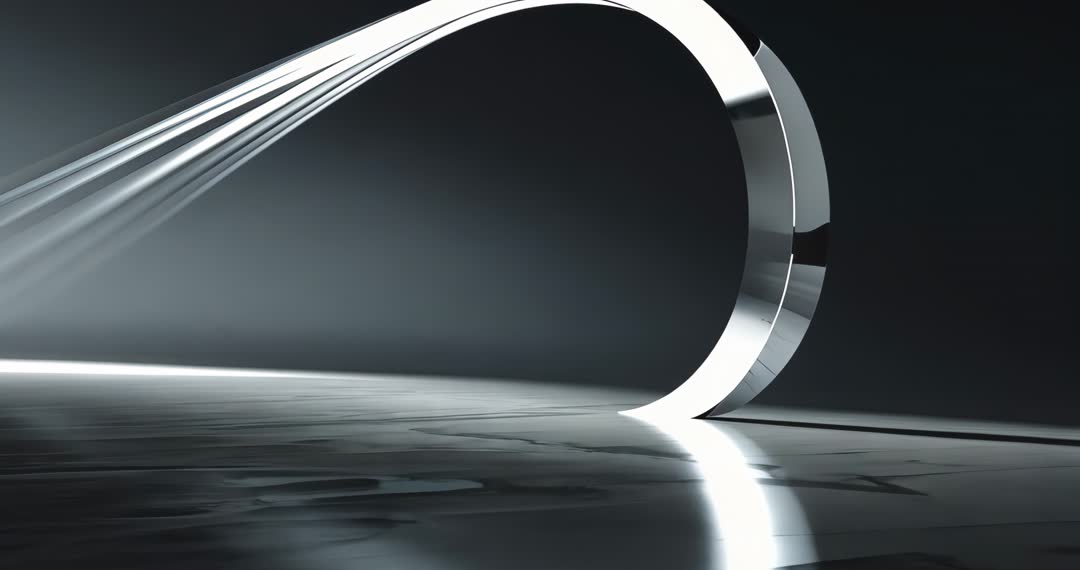 AI Generated Image. This video showcases a stunning display of a metallic loop with sweeping light beams, rotating elegantly across a reflective floor. The scene embodies futuristic design aesthetics, combining technology and art. It serves as an ideal visual for themes of innovation, modernity, and advanced technology. Perfect for usage in digital design projects, advertisements introducing new tech products, or as dynamic backgrounds in virtual environments.