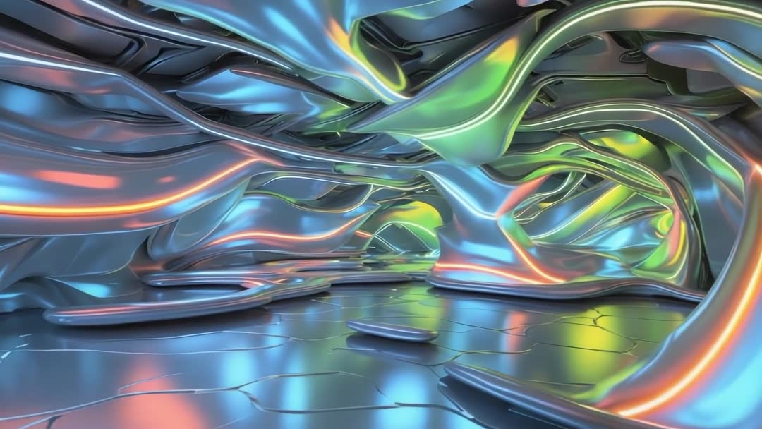- Futuristic Metallic Ribbons Reflecting Light in Immersive Sci-Fi Chamber