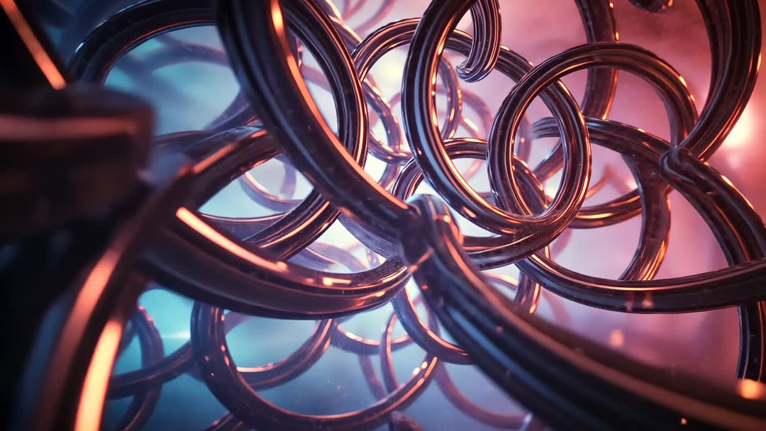 AI Generated Image. The visuals portray a sequence that follows a journey through a tunnel composed of intricately woven metallic rings, vividly illuminated by pulsing colored spotlights and drifting sparks. This scene expertly merges digital art with advanced technology to create a dynamic and vibrant experience. Suitable for use in projects involving futuristic themes, technology showcases, digital art exhibitions, or background visuals for tech conferences.