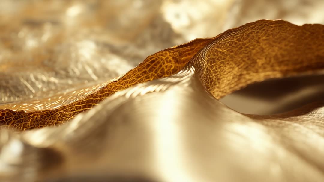 AI Generated Image. A close-up of a golden veined membrane with a shifting metallic texture that evolves across a surface. Light reflects dynamically creating luxurious, futuristic visual effects. Ideal for use in contexts suggesting modern technology, high-end design concepts, or AI-generated art motifs.