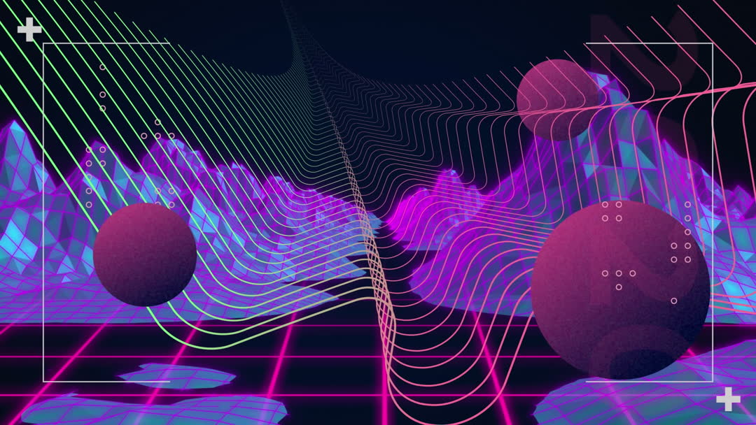 Showcases an abstract futuristic scene depicting the metaverse, featuring glowing grids and vibrant globes with digital data videory. Ideal for illustrating concepts in modern technology, virtual worlds, or network simulations. Useful for presentations on digital innovations, tech industry trends, or sci-fi backdrops.