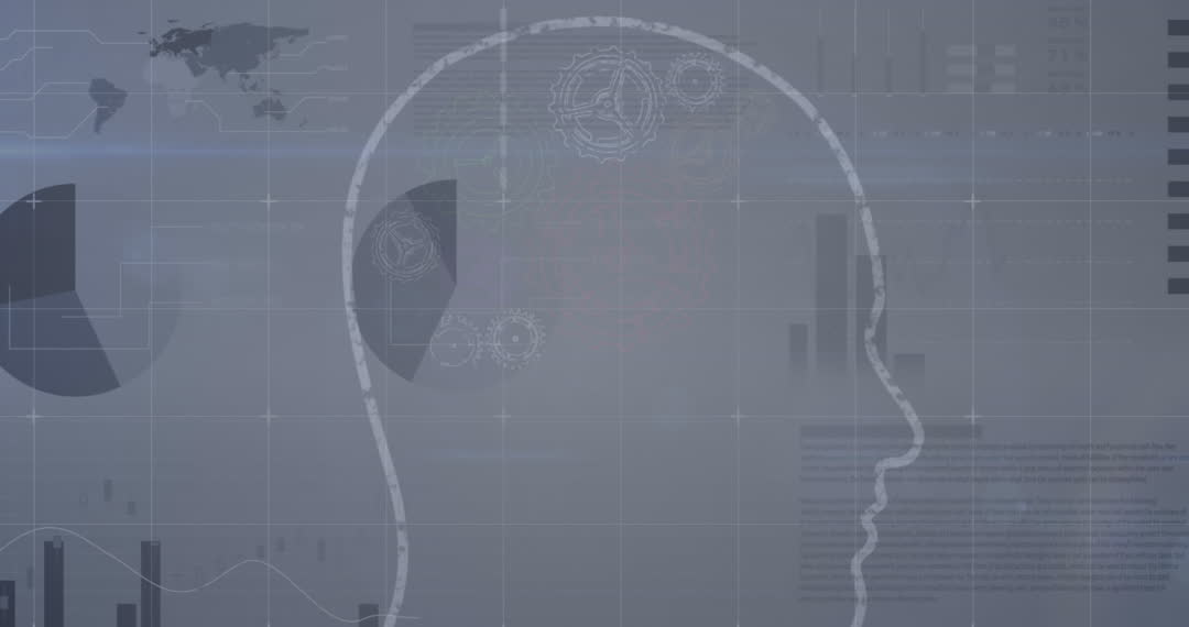 Silhouette of human head with cogs symbolizes innovative thinking, aptly framed by clinical digital design elements including fluctuating market graphs and trends from diverse data points. Suitable for illustrating AI in trading, strategic market analysis, and cutting-edge business innovation.