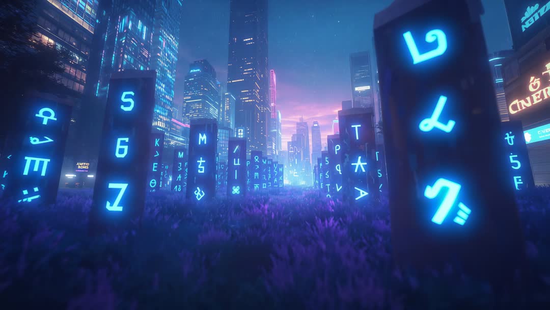 AI Generated Image. Video showcases futuristic monoliths with glowing blue symbols emerging from a lavender grass field against a dazzling neon horizon. City's skyscrapers adorned with animated digital signs add depth, evoking dystopian, cinematic vibes. Perfect for use in science fiction projects, tech-focused advertising, visual art displays, or depicting digital futures.