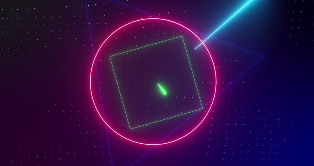Vibrant neon artwork featuring geometric shapes such as circles, squares, and triangles against a dark background. This modern and digital theme is suitable for technology presentations, backgrounds for electronic music videos, or futuristic-styled graphics. The combination of bright neon colors creates a dynamic visual perfect for creative designs.