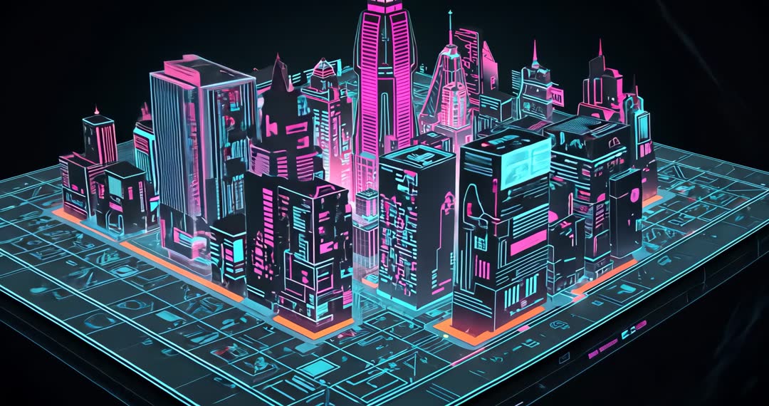 AI Generated Image. This animation showcases a futuristic city glowing with vibrant neon lights as the camera gracefully circles around. It highlights intricate designs of skyscrapers framed on a detailed grid platform. Perfect for use in presentations on futuristic or cyberpunk themes, articles exploring urban designs of tomorrow, or as background visuals in sci-fi and tech-related video projects.