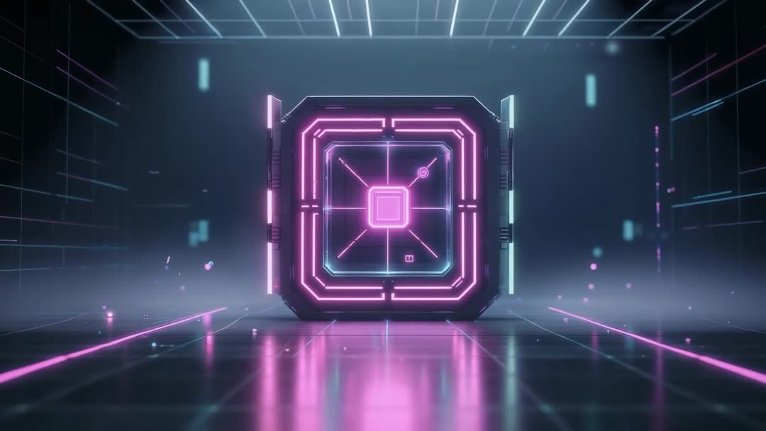 AI Generated Image. The video depicts a neon-lit cube set in a digital chamber with pink and cyan pulsating circuits illuminating the reflective floor. Ideal for illustrating themes of advanced technology, digital innovation, or visualizing AI-generated art. Suitable for use in technology blogs, presentations on futuristic concepts, or promotional materials for tech companies.
