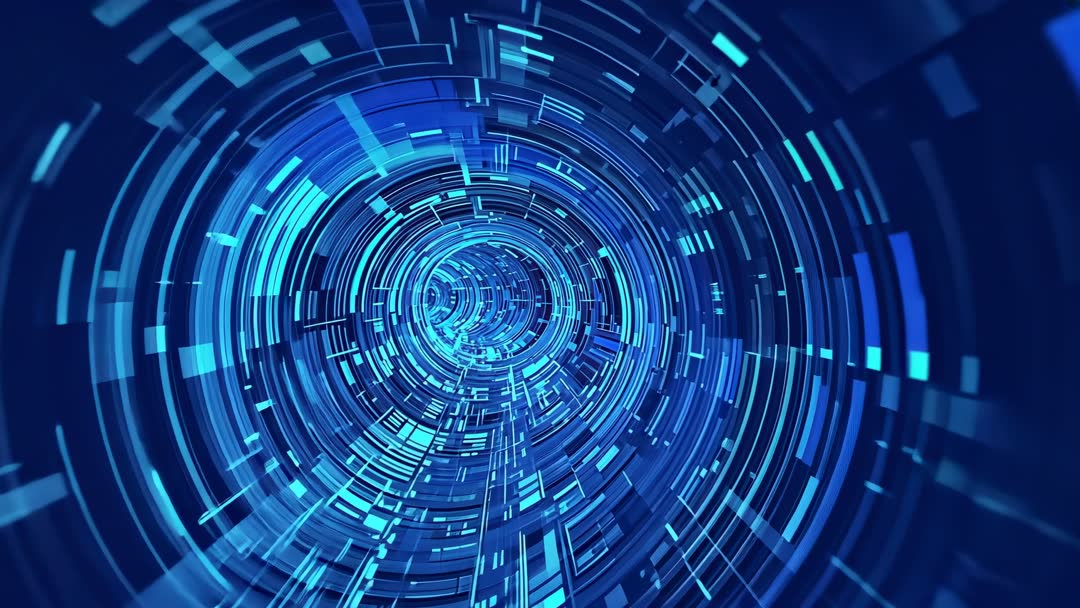 AI Generated Image. Showing rotating neon data tunnel moving toward viewer with concentric rings, rectangular data blocks, and streaking cyan light creating strong sense of depth and forward motion. Featuring high-contrast blue palette and geometric motion ideal for tech-focused visual storytelling. Working as opener for technology presentations, enhancing product demo reels, powering sci-fi trailer intros, underpinning website hero banners, and enriching livestream overlays. Supporting seamless looping for background playback and easy color grading to match brand palettes. Delivering dynamic visual energy for AI, cybersecurity, networking, and virtual reality themes.