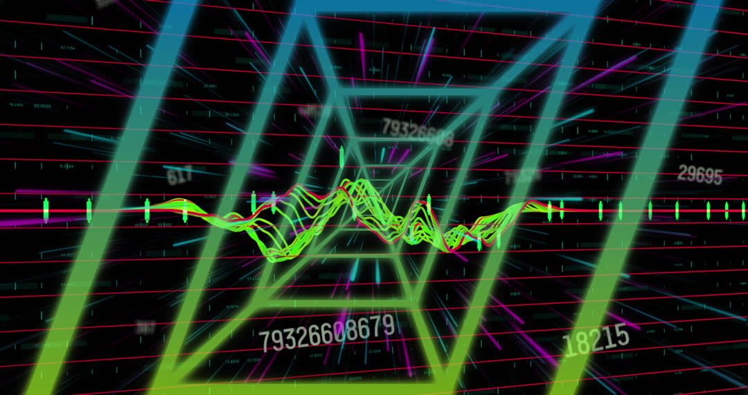 This vibrant illustration of a neon tunnel with changing numbers and digital waveforms symbolizes the fast-paced world of data processing and technological concepts. The dynamic movement enchants viewers, making it ideal for illustrating articles, presentations, or media related to business technology, digital futures, or innovation. It conveys a sense of cutting-edge advancements and continuous motion.