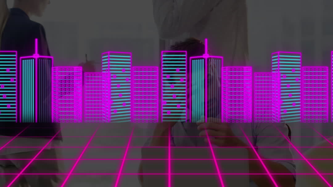 Vibrant animation of neon skyscrapers creating a digital cityscape, set against the backdrop of business professionals engaging in a modern office. Perfect for illustrating technology-driven business concepts, showcasing digital transformation, or enhancing content on entrepreneurship and innovation. Ideal for presentations and advertising in tech industries.