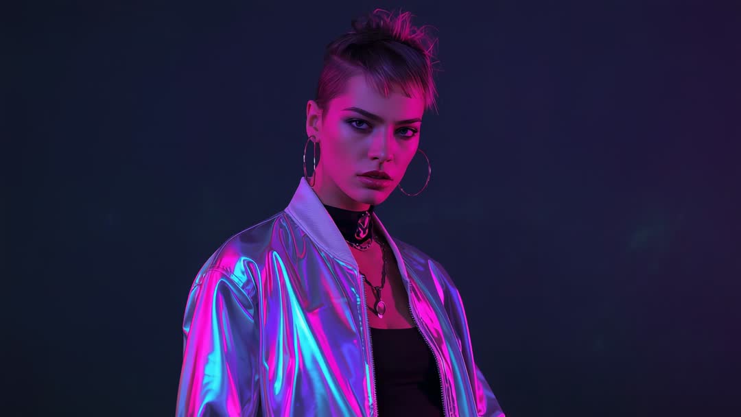 - Futuristic Neon Fashion with Metallic Bomber in Studio