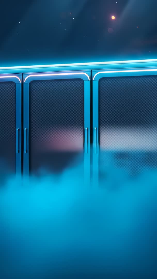 AI Generated Image. Panning camera revealing neon-framed triptych cabinet through rolling fog, centering on center panel for dramatic stage reveal. Featuring glowing teal-blue trim, textured metal panels, vertical composition and soft ambient beams piercing smoky air. Offering clean central space and blurred foreground fog for overlaying titles, logos or product shots. Using for event opener, concert intro, product launch reveal, mobile ad, social story, streaming thumbnail, cinematic trailer or title card. Suggesting edits include slowing motion for suspense, adding sound design with synth pad and whoosh, color grading to match brand palette and looping for extended background use. Delivering 9:16 aspect ratio, high-contrast neon highlights and cinematic mood suitable for tech, entertainment and retail campaigns.
