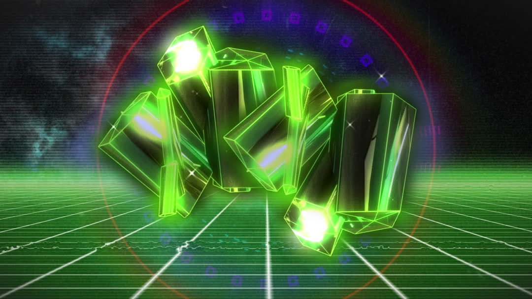 Depicting a cluster of neon green crystals suspended over a digital grid surface, exemplifying advanced cinematographic techniques. Ideal for themes related to futuristic technology, digital innovation, or sci-fi concepts. Suitable for use in tech presentations, futuristic website headers, or gaming previews.