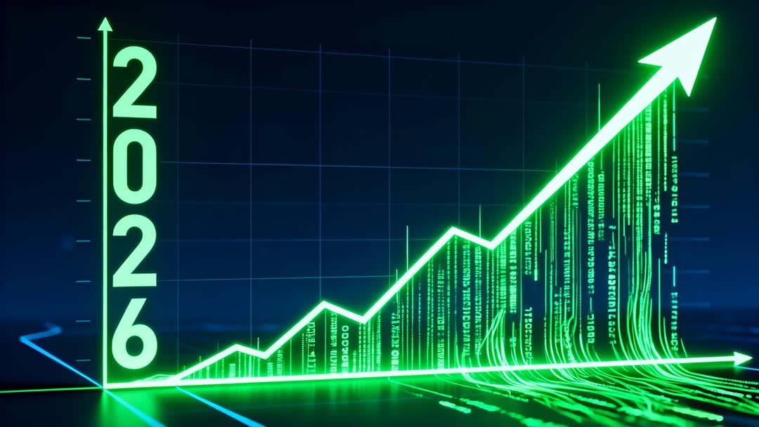 - Futuristic neon-green analytics graph rising toward 2026 projection with code-stream visuals