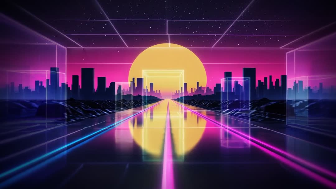 - Futuristic Neon Grid Cityscape with Sun and Wireframe Elements