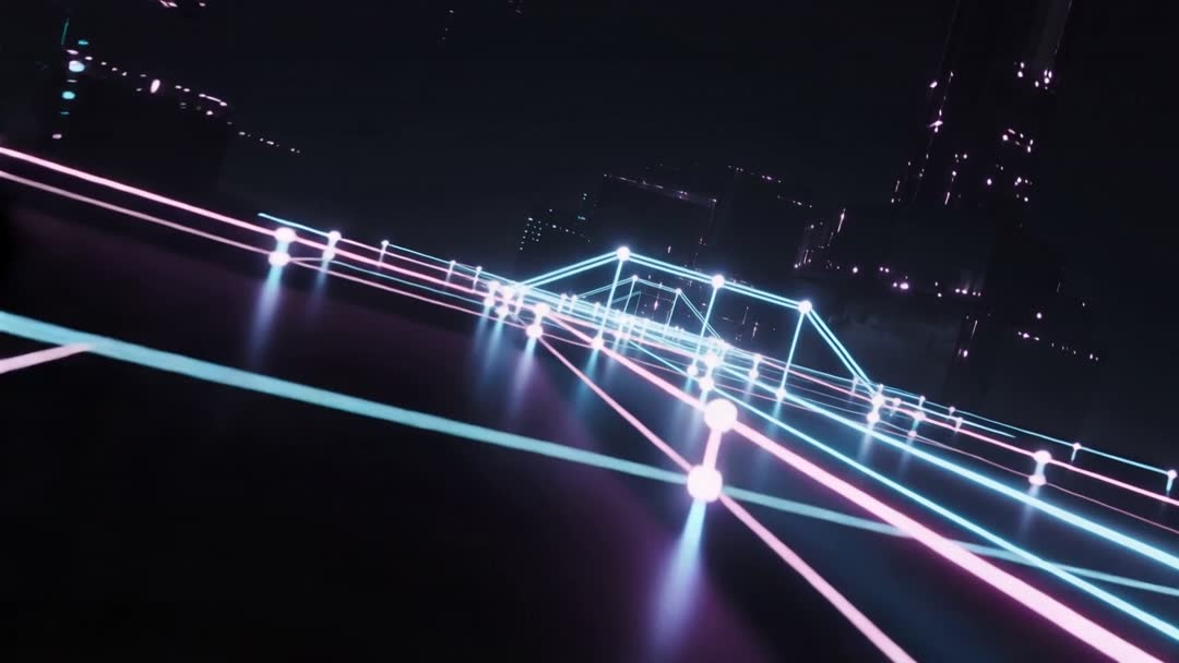 AI Generated Image. Showing sweeping camera movement across neon grid with pulsing nodes rising to form elevated bridge over glossy plane toward horizon. Featuring cyan and pink light trails crossing lattice, creating retro-futuristic cyberpunk mood. Distant city skyline silhouettes glowing, providing urban context and depth. Serving technology presentations, AI and data visualizations, cyberpunk title sequences, music video backdrops, advertising for tech events, and brand promos. Enabling looping motion backgrounds for website hero headers, social media promos, VJ visuals, and live performance projection. Suggesting color grading options: increasing contrast for harsher neon, slowing camera motion for contemplative mood, adding glitch effects for edgy tech feel.