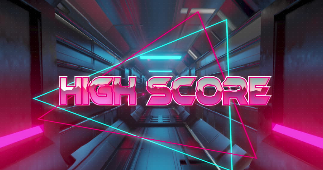 Neon high score animation featuring triangular designs and a sci-fi tunnel background, blending retro gaming aesthetics with futuristic elements. Suitable for retro-futuristic video game projects, digital illustrations on gaming themes, or technology-inspired presentations and promotions.