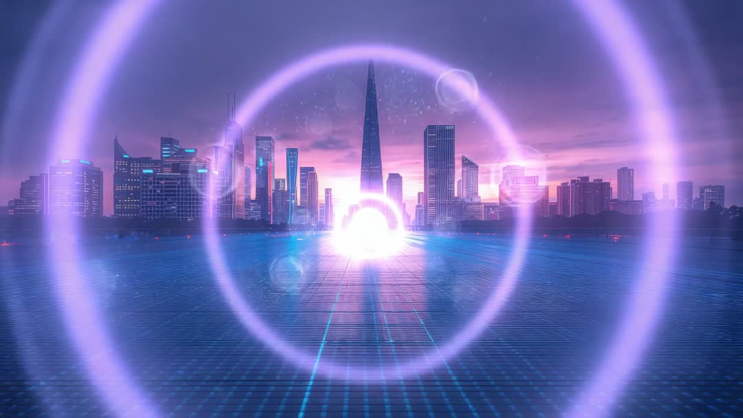 AI Generated Image. In this video scene, a bright and pulsating neon-purple orb dynamically pulses concentric rings on a grid-patterned floor, symbolizing innovation and advanced technology. The vibrant city skyline in the backdrop enhances the scene, emphasizing a futuristic and cyberpunk atmosphere. This visualization is perfect for projects focused on technology, digital innovation, futuristic urban landscapes, AI research, or creating immersive narratives in sci-fi potential themes.