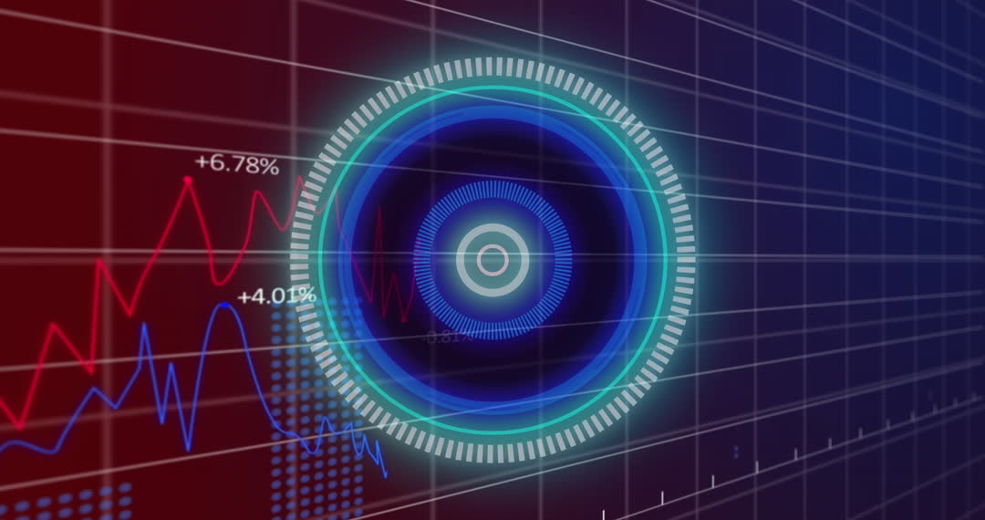 Futuristic and vibrant visualization depicts a neon circular scanner overlay on dynamic statistical data graphs, highlighting growth trends against a gradient blue background. Ideal for business presentations, digital transformation projects, or technology-focused reports illustrating data analysis, stock market projections, and innovative computer interfaces.