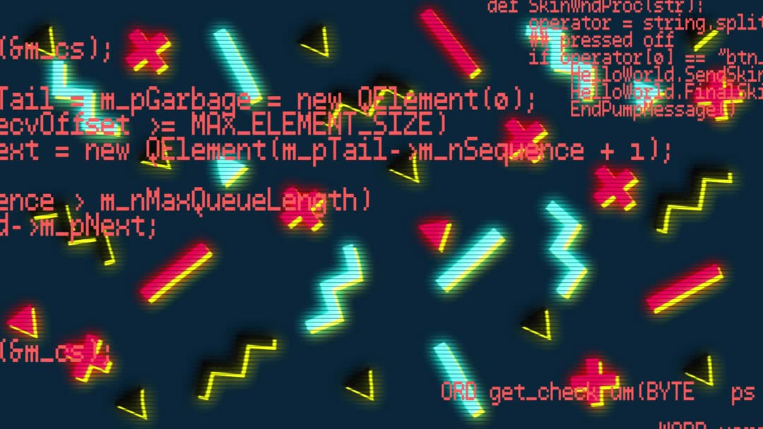 - Futuristic Neon Shapes and Scrolling Code on CRT Screen