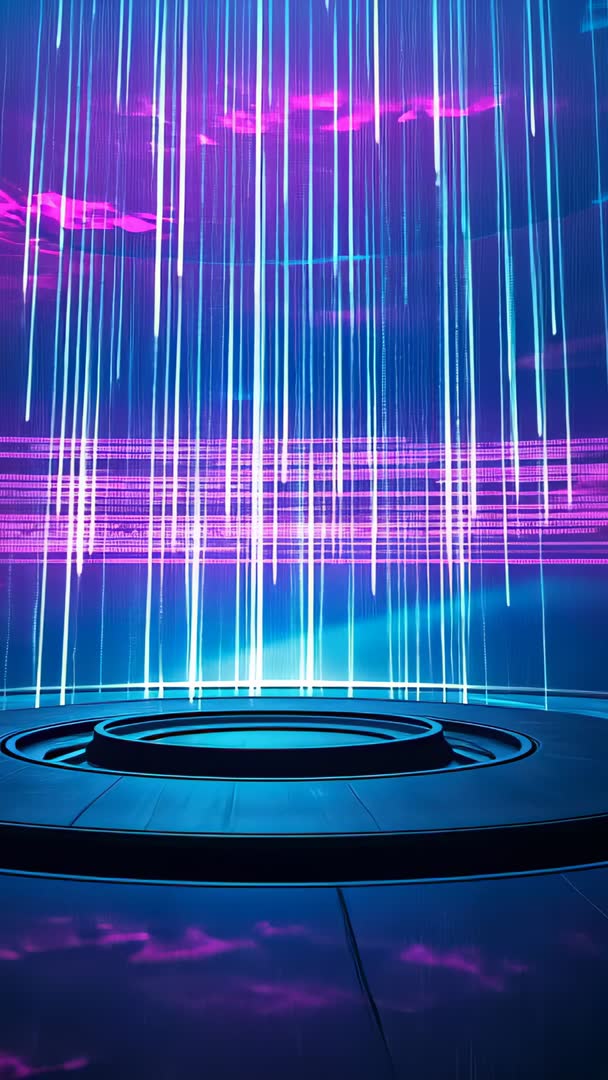 AI Generated Image. Vertical video showing circular launch platform bathed in cyan beams while magenta holographic grid forming above. Vertical light columns streaming down and intersecting to create layered digital texture and reflective floor highlights. Composition emphasizing symmetry and depth, providing strong focal point for product reveal, tech presentation, game intro, or futuristic scene transition. Color palette working well for cyberpunk branding, music visualizers, event promotions, and sci?fi trailers. Upper negative space offering clean area for logo, headline, or motion graphics overlay. Loopable animation potential for mobile backgrounds, social stories, vertical ads, and livestream stinger. Delivering high-impact visual energy for marketing, entertainment, UI mockups, and stage design concepts.
