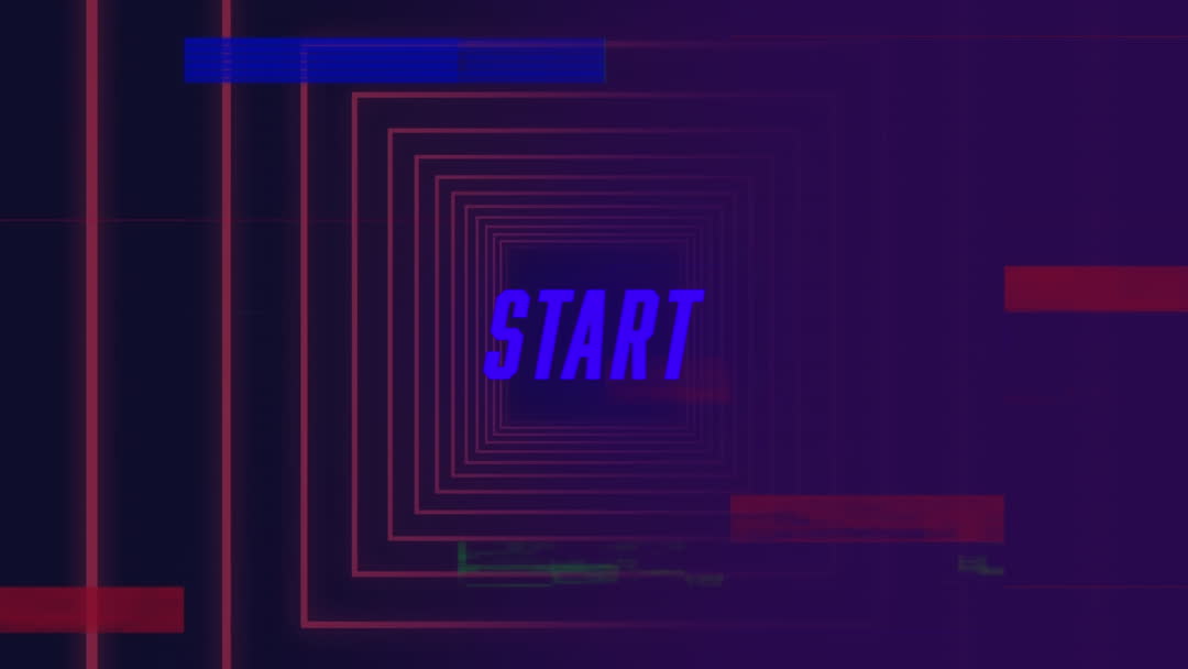 Bright neon squares zoom towards a central start text, creating a dynamic digital composite. Perfect for use in video game promotions, retro-style motion graphics, or as an eye-catching introduction for technology-themed presentations.