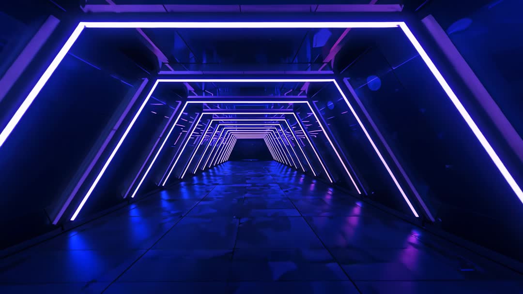 - Futuristic Neon Tunnel Pulsing Purple LED Frames Reflecting on Metallic Floor, Cinematic Loop