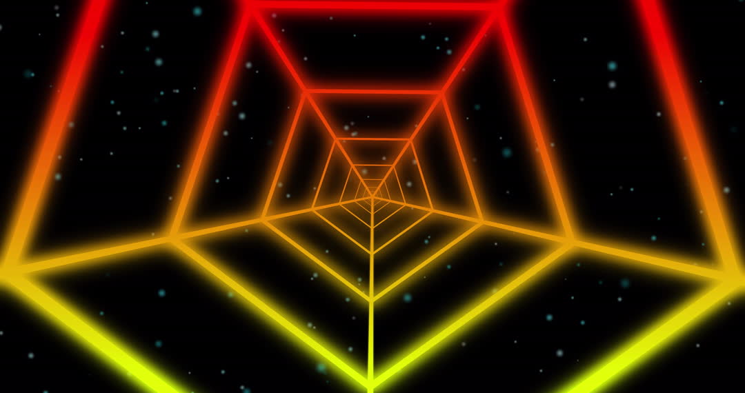 Dynamic neon-lit tunnel features vibrant red, yellow, and green geometric shapes creating a sense of movement in a digital abstract space. Ideal for use in sci-fi or technology presentations, backgrounds for music videos, and digital art projects focused on futuristic themes.