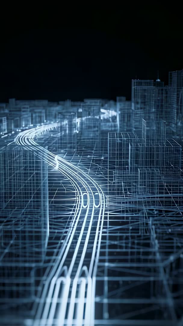 AI Generated Video. Showing neon wireframe city with moving glowing triple roadway, parallax motion and deep perspective. Ideal for tech presentations, smart city demos, transportation concept visuals, app intros, social media vertical ads and background for UX/UI showcases. Serving as background loop in keynote slides, website hero sections, mobile stories and promotional reels. Color palette featuring cool blue neon glow and high contrast on dark backdrop, cinematic mood. Motion design teams using it to illustrate data flow, network visualization, digital twin, urban planning and autonomous vehicle routing. Optimizing for 9:16 aspect ratio and mobile-first campaigns, looping friendly for seamless playback.