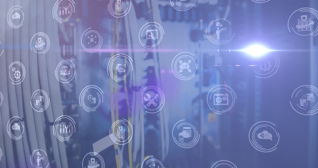 Digital icons are overlaid on computer cables symbolizing interconnected networks. Suitable for illustrating concepts of networking, technology infrastructure, or digital data systems. Useful for backgrounds in technology presentations, websites, and educational content about data processing and cybersecurity.