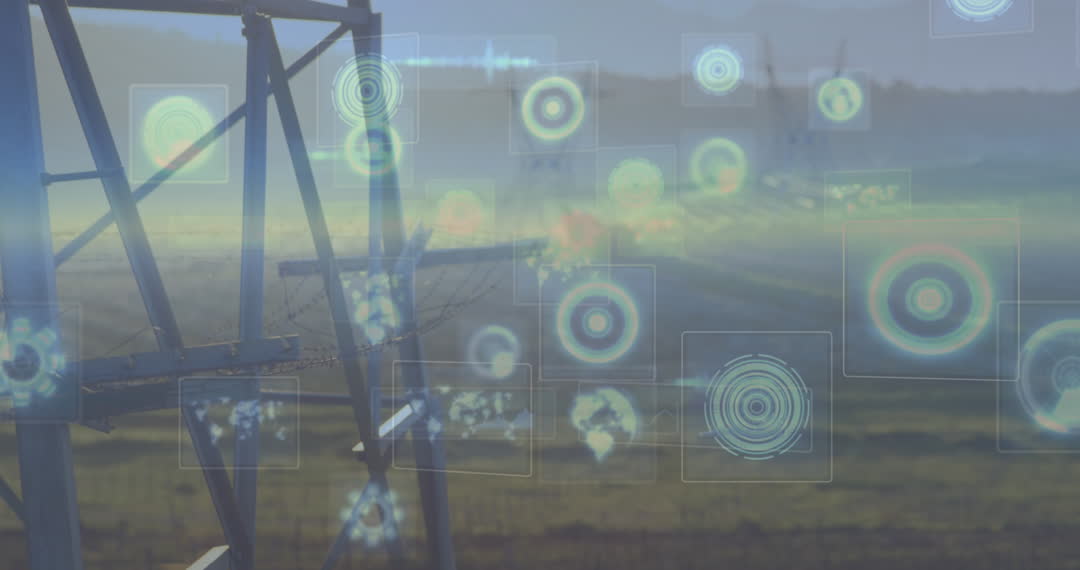 Visual combining digital network icons with a rural backdrop. Perfect for illustrating cybersecurity topics or demonstrating advanced technology interfaces in presentations. Useful for articles discussing infrastructure, connections, or the merger of digital and natural environments.
