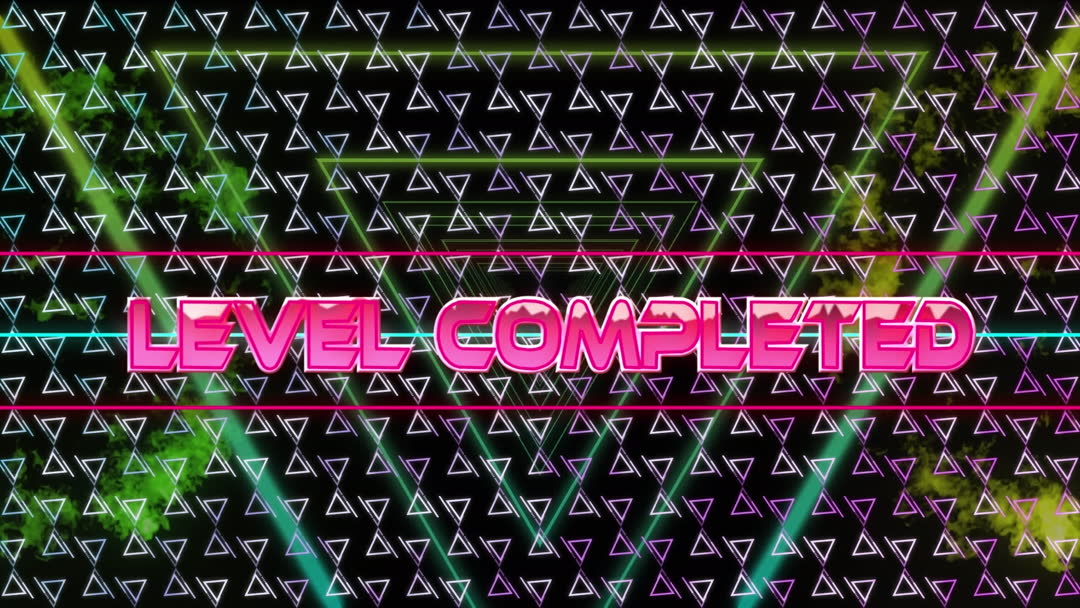 Futuristic animation featuring neon geometric patterns and 'Level Completed' text. This design is well-suited for video games, tech presentations, or digital content aimed at younger audiences. It highlights modern visual effects with its dynamic, colorful visuals that enhance the completion message, making it an excellent choice for multimedia projects.