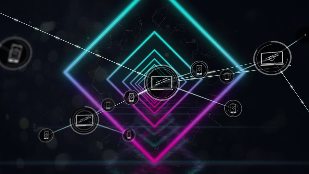 This video depicts a sophisticated digital network with various electronic device icons interconnected against a neon hexagonal design. Ideal for illustrating digital connectivity, technological innovation, and modern solutions. Useful for websites and publications focused on advanced tech, communications, and global networking concepts.