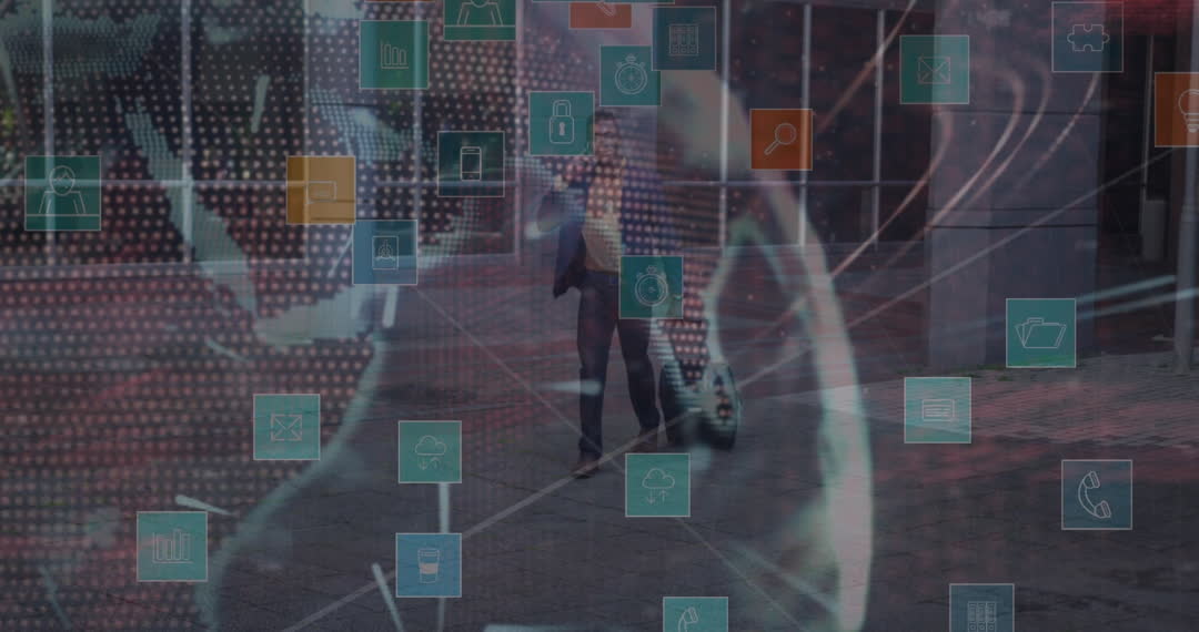 Digital interface with network and social media icons overlays athletes in motion, suggesting themes of connectivity, futurism and modern technology. Ideal for use in presentations about digital transformation in sports or illustrating the integration of technology in everyday movements.