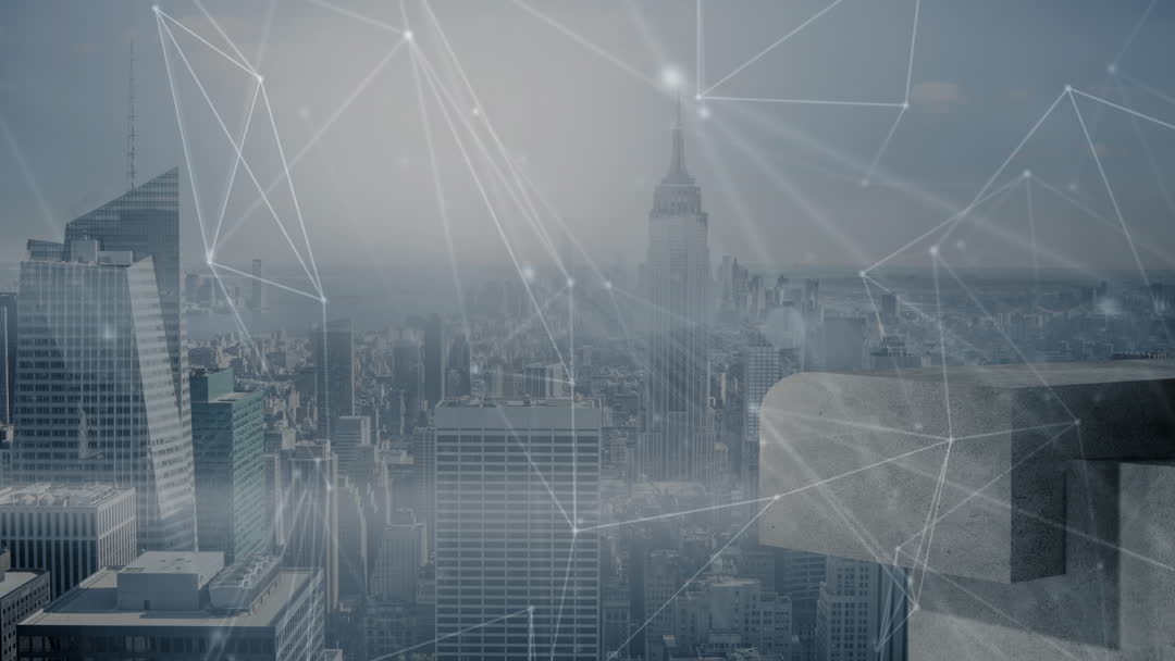 Abstract digital network concept superimposed on a modern city skyline, illustrating connections and communication technology. Useful for presentations on urban innovation, global networks, information technology, and the digital economy.