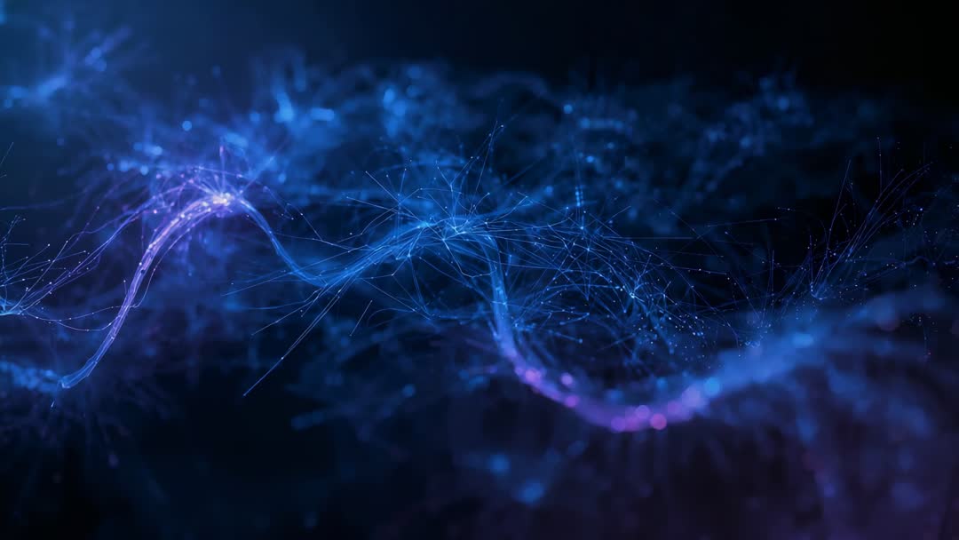 AI Generated Image. This abstract visual illustrates dynamic network strands pulsing with light punctuated by branching particle nodes against a dark background. The scene embodies the essence of futuristic technology and digital innovation, suggesting themes of advanced connectivity, AI development, and data science. This video frame is ideal for promoting technological expertise, enhancing digital marketing materials, or serving as a compelling backdrop to suggest themes of data flow and network structures in technology projects.