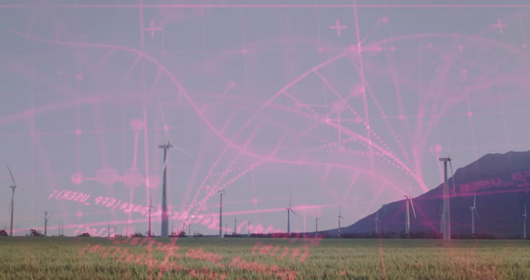 Video showcases interaction between sustainable wind energy and digital technology. Overlayed pink network forms around turbines, mapping energy flow, emphasizing interaction between clean energy and technology. Great for highlighting futuristic sustainable practices or digital innovations in renewable energy presentations.