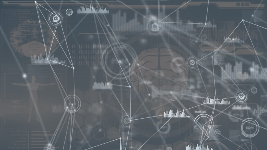 This visualization depicts a complex network diagram with lines, nodes, and data graphs intricately linked against a grey background. Central to the video are scientific notations surrounding a 3D visual of a brain, symbolizing the intersection of neuroscience and information technology. Ideal for use in editorials or presentations focusing on scientific research, data science, AI, and tech industry innovations.