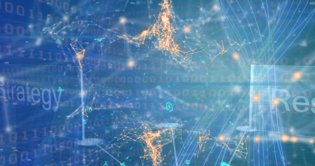 Depicts an advanced digital network with interconnected nodes, binary code overlays, and business-related text suggesting strategy. Ideal for representing data-driven business management, futuristic technological advancements, or global communications. Perfect for use in presentations, advertisements, and articles relating to digital transformation or innovative tech solutions.