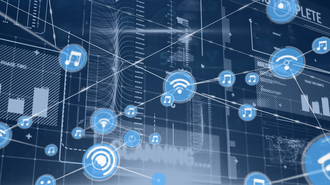 This illustrative animation showcases a digital network with interconnected music icons and balanced charts in a futuristic style. Ideal for technology-related themes, it visually represents connectivity and data processing concepts. Suitable for use in promotional materials for tech conferences, as a backdrop in digital transformation projects, or education on modern digital communication. Engaging for presentations on global networking or technological advancements.