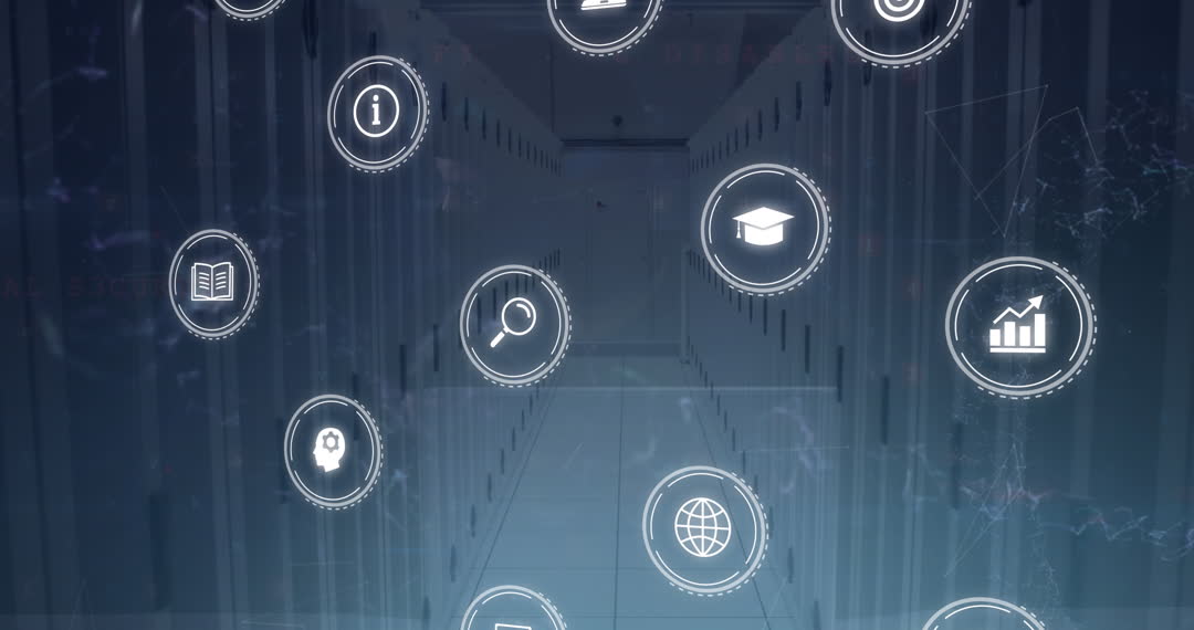 Showing a digital representation of networking technology through various icons, this video might be used for illustrating topics related to information technology, network infrastructure, online education, or global connectivity. It highlights a modern data center environment, depicting the seamless integration of technology and innovation.
