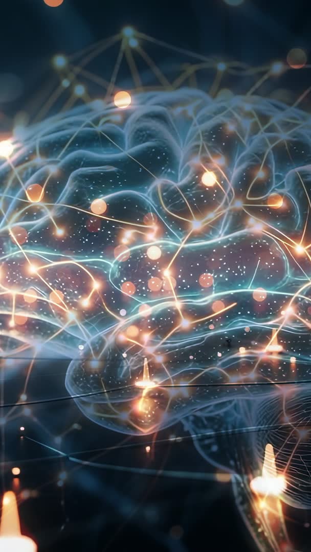 AI Generated Image. Vertical video showing futuristic brain network activating in void, featuring glowing nodes, pulsing neural threads, and drifting data particles. Camera slowly tracking across layered brain forms with electrical connections sparking and propagating, creating cinematic depth and immersive motion. Color palette combining deep blues and warm golds, offering high-contrast tech aesthetic and clear visual hierarchy. Suiting tech presentations, AI and machine learning intros, neuroscience explainers, medtech demos, startup pitch decks, social vertical ads, conference openers, website hero loops, and ambient backgrounds for events. Providing clear negative space for text overlays, lower thirds, logo reveals, and easy looped playback. Optimizing delivery for short-form vertical platforms such as Instagram Reels, TikTok, mobile ads, and stories.