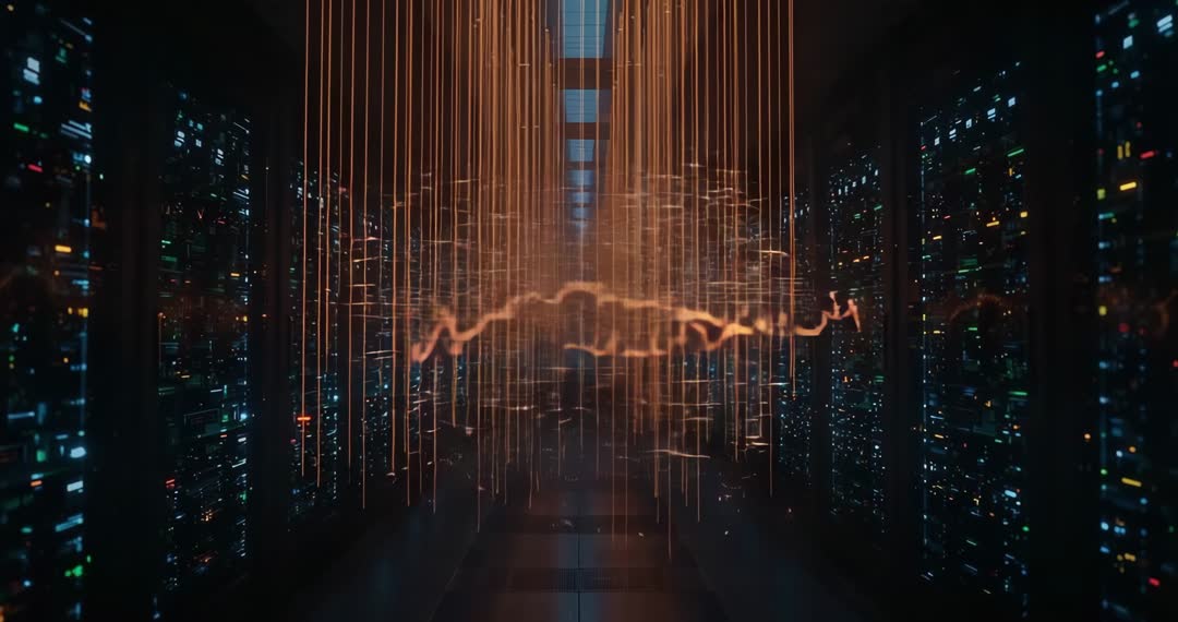 AI Generated Image. A futuristic corridor of server racks features a glowing orange waveform, symbolizing active data processing and streaming. Pulsating lines create a visual representation of a dynamic neural network, illustrating modern innovations in computing and artificial intelligence. Perfect for use in presentations related to advanced technology, data management, digital transformation, or AI-driven solutions.