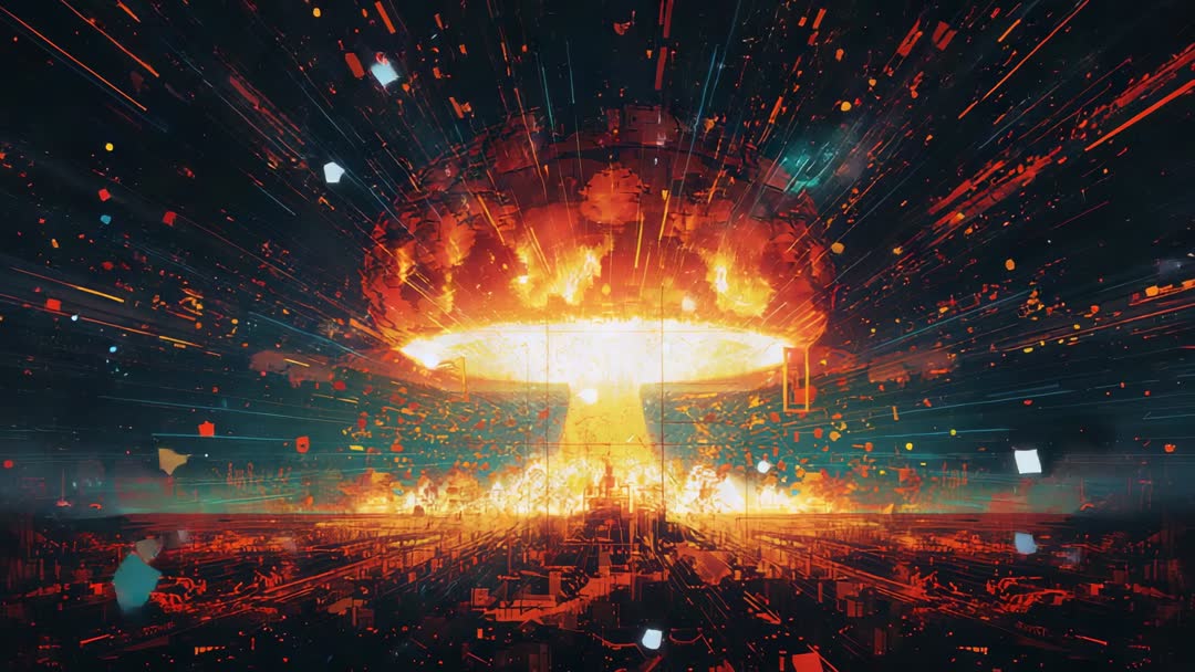 AI Generated Image. Video combines elements of a massive, powerful explosion with technological motifs, showcasing a dynamic portrayal of chaos and destruction in an urban landscape. The fiery blast forms a stunning and foreboding mushroom cloud. This piece is ideal for visual projects involving themes of technology-driven apocalypse, cautionary tales about digital advancement or presentations set in dystopian worlds.