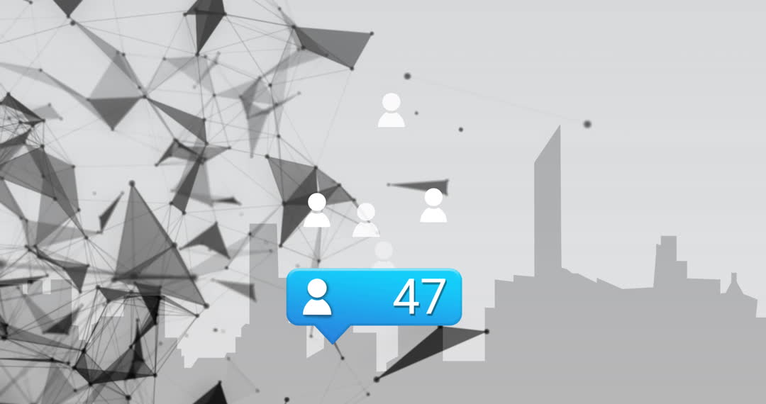 This visual represents a concept of futuristic digital networking interlaid over a city skyline. It illustrates connectivity and digital interactions symbolized by animated media icons and network lines. It is ideal for usage in projects involving technology previews, smart city concepts, digital marketing, or innovation presentations.