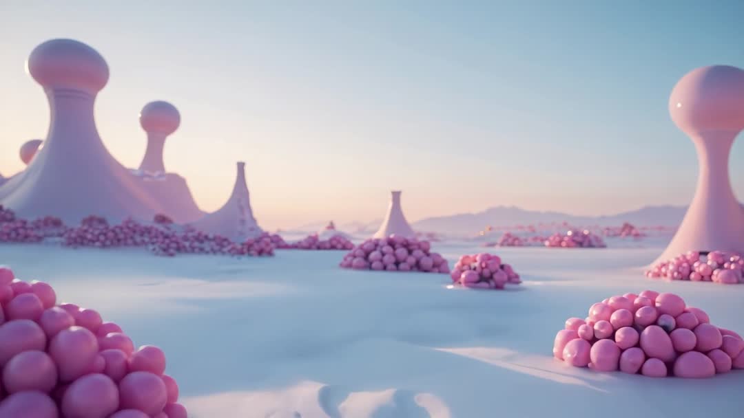 AI Generated Image. Features a surreal landscape with moving pink sphere clusters scattered across a smooth white plain and complemented by organic, towering structures. Ideal for illustrating concepts of futurism, creativity, and tranquility in digital art, magazine editorials, or abstract design projects. Its serene yet curious vibe makes it suitable for future technology themes or as an inspiring background for artists and designers.