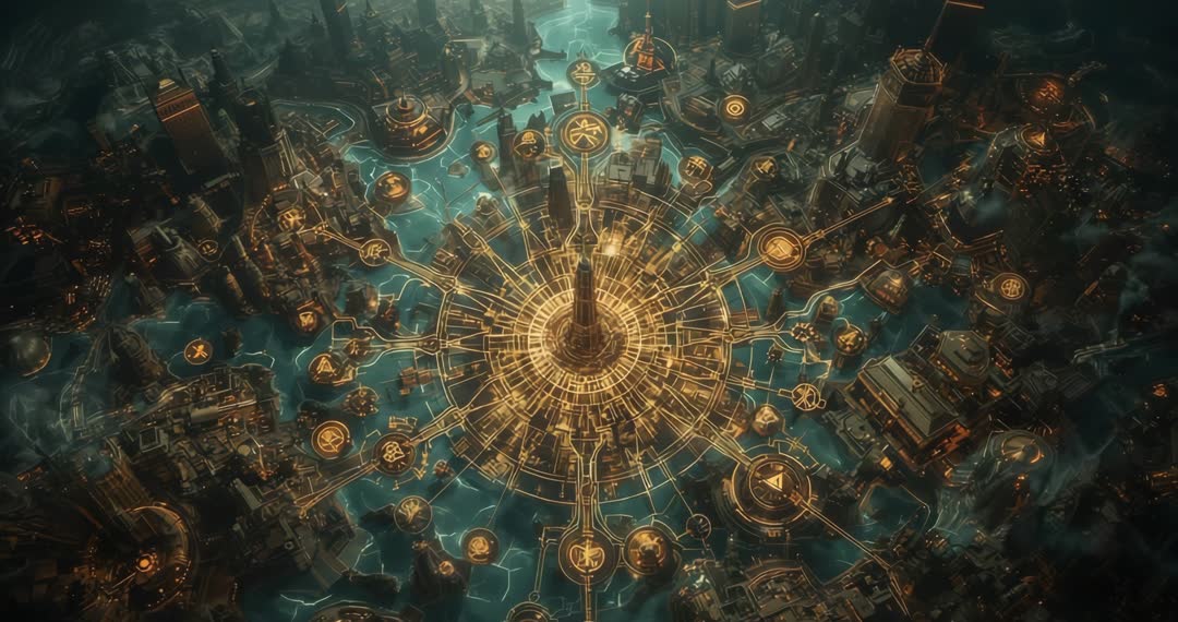 AI Generated Image. The video frame captures a pulsating golden radial network spreading across a dense urban landscape, with a central spire highlighted by interconnected nodes. Ideal for illustrating concepts in futuristic technology, infrastructure development, or digital innovation, this content suits contexts discussing cutting-edge urban planning or AI advancements, and projects related to connectivity and future designs.