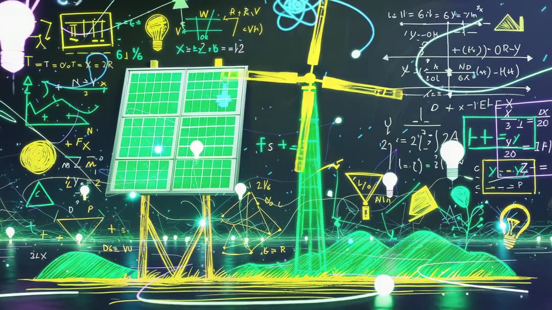 AI Generated Image. Shows neon-themed animation blending technology and renewable energy with digital math equations backdrop. Animation plays vibrant role showcasing solar panels and wind turbine intertwined with calculation and light bulb icons symbolizing innovation. Perfect for visual display in educational or promotional materials focused on clean energy, sustainability, the future of technology, digital innovation.