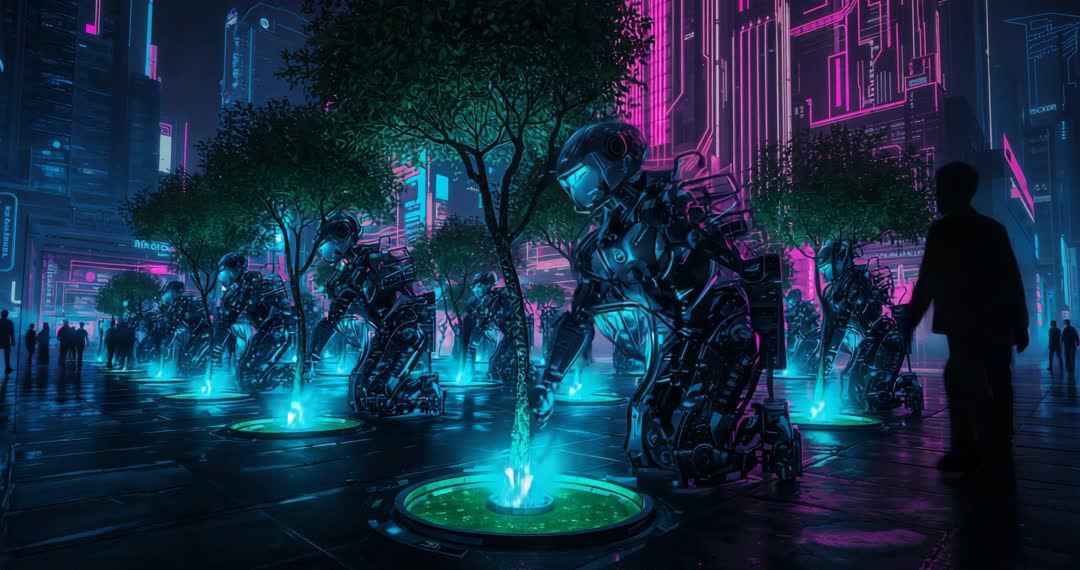 - Futuristic Robots Cultivating Neon Plaza with Saplings