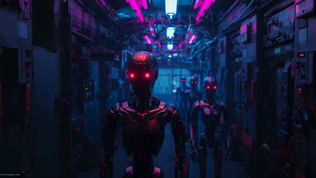 - Futuristic Robots Exploring High-Tech Neon Corridor
